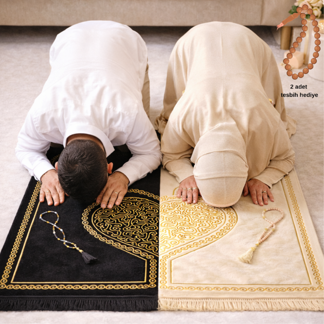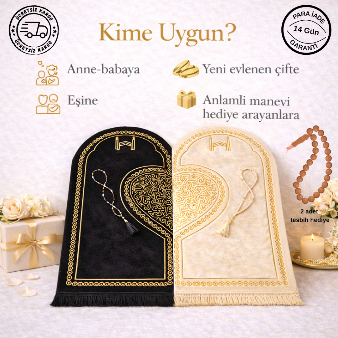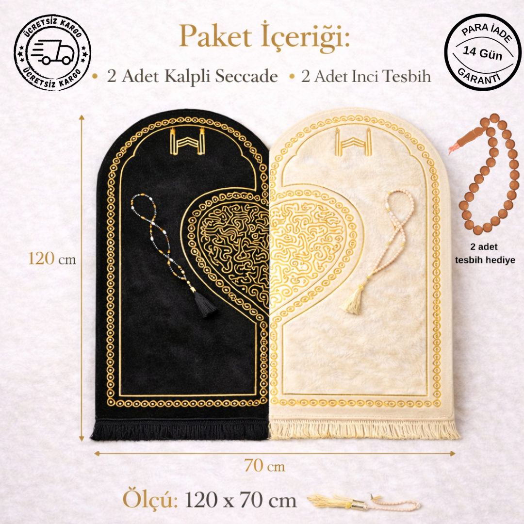 Set içerisinde iki adet kalpli seccade ve tesbihler bulunmaktadır