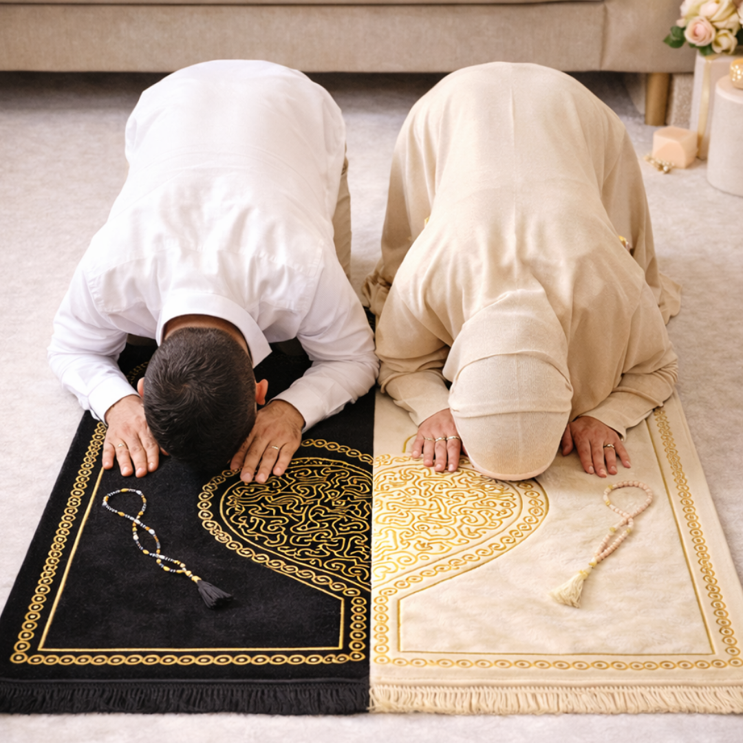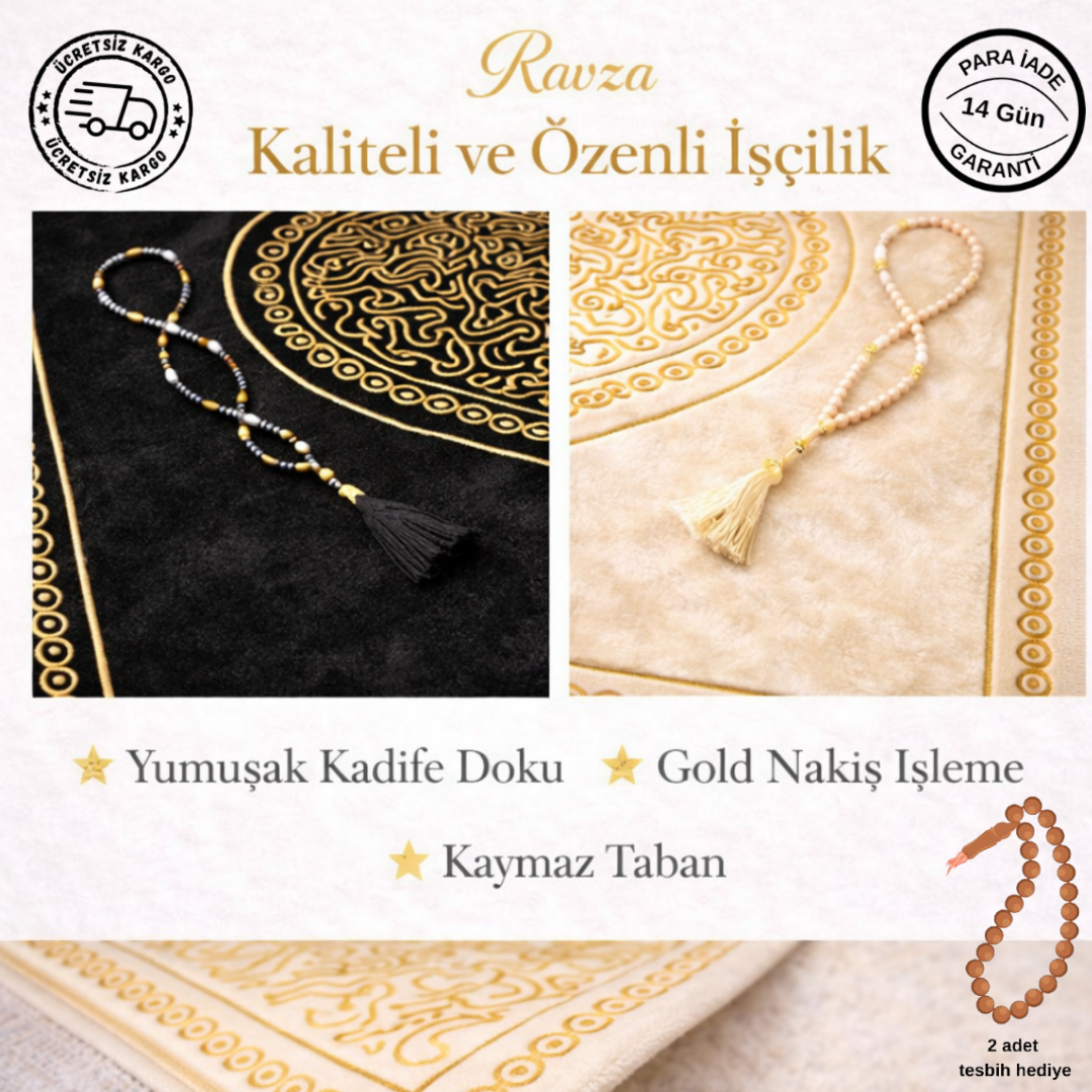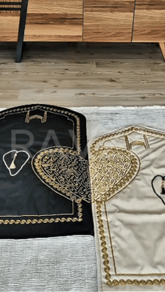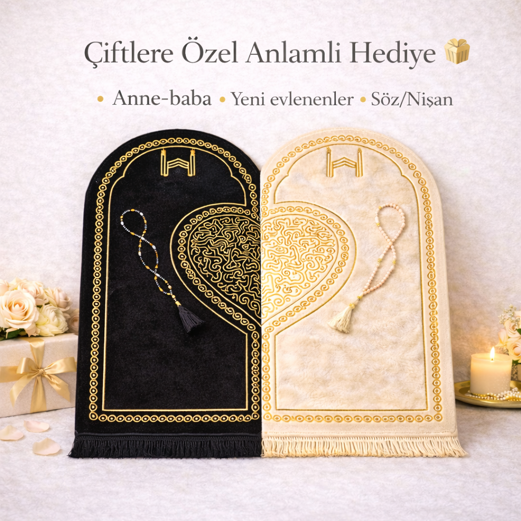 Set içerisinde iki adet kalpli seccade ve tesbihler bulunmaktadır