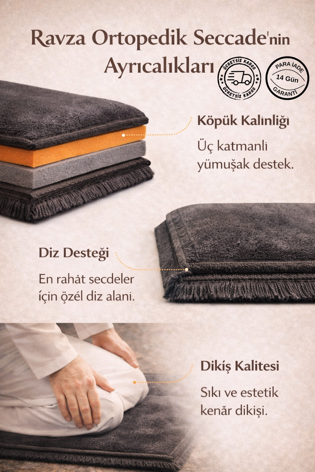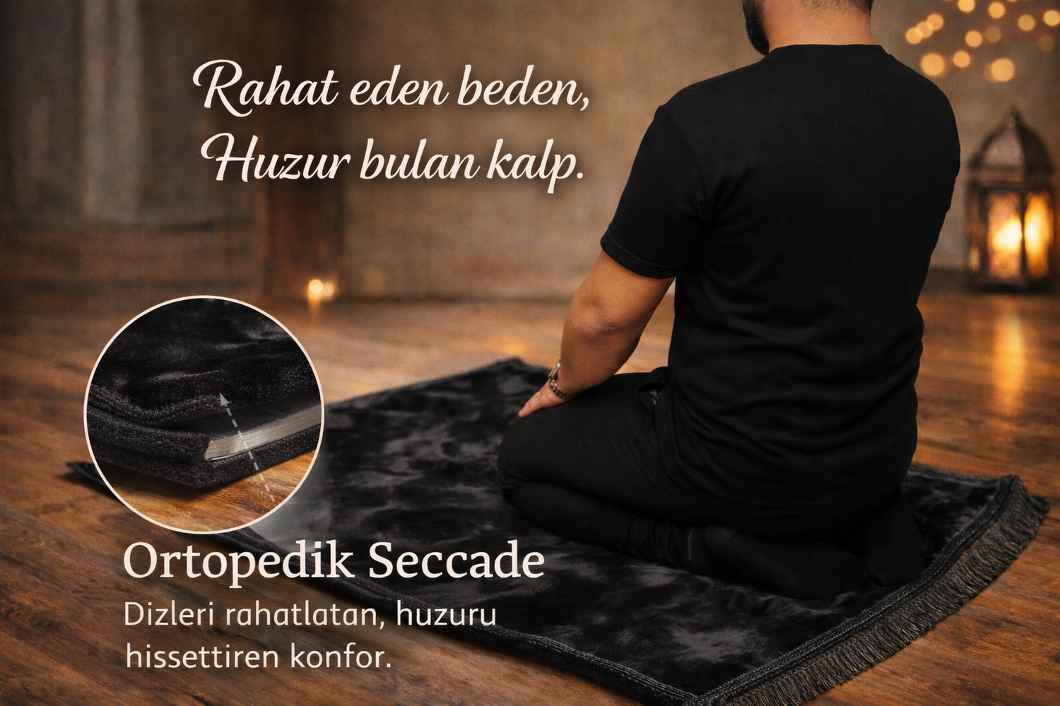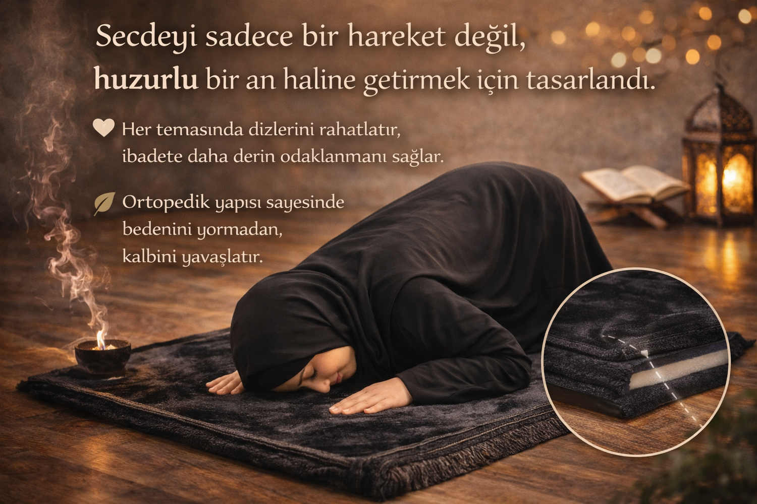 🤍 Her temasında dizlerini rahatlatır, ibadete daha derin odaklanmanı sağlar.